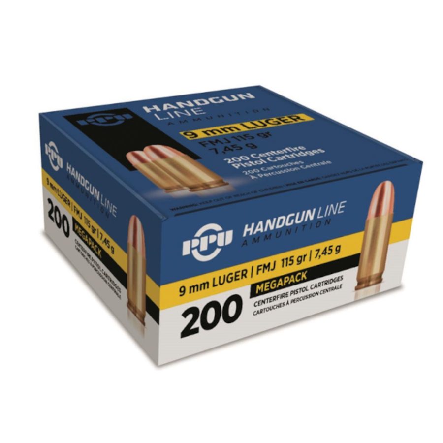 PPU PPH9F1M PISTOL AMMO 9MM LUGER, FMJ, 115GR, BOX OF 200 RDS