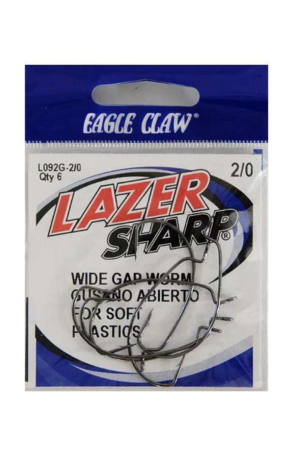 Lazer Sharp L092GH-2/0 Lazer Sharp Extra Wide Gap Worm Hook, Platinum Black color. Lazer Sharp Hooks are Designed, engineered and tested in the United States using American Steel, the patented Lazer Sharp needlepoint and forged technology ensures a sharper, stronger, longer hold than the leading competition. The ultra-sharp and super durable needlepoint hook point featured on all Lazer Sharp hooks along with purpose built, technique specific hook designs can improve hook up ratio and presentation.
