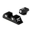 Complete 3 Dot night sight set for the Glock automatic pistols. Plastic blades are replaced with all steel blades with night sights. Fully warranted for up to 12 years. Construction for strength starts with a tritium filled glass lamp core which is surrounded by a silicone shock cushion. This is further protected within an aluminum sleeve that is faced with a hard, polished sapphire window.