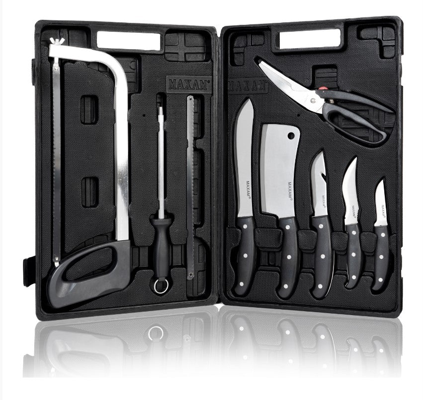 SET INCLUDES 10-inch shears, hacksaw with 4 stainless steel saw blades, sharpening steel, 13-1/2-inch cleaver, 11-1/2-inch butcher knife, 9-1/2-inch skinning knife with gut hook, 8-1/4-inch caping knife, and a 7-inch paring knife.