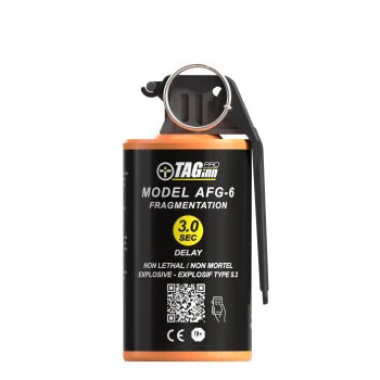 AFG-6: Hand Grenade (Set of 6). The AFG is a pyrotechnic device designed for Tactical Combat Sports or Training--intended to simulate a frag grenade. It is filled with dried peas  and made of foamed polyurethane and cardboard body. The ring-pull triggering mechanism is similar to that of a real hand grenade: it will not ignite until the safety lever is released. Fragmentation is up to 15 meters.