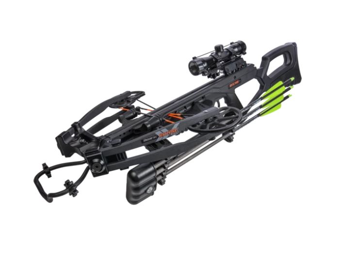 Cet ensemble d'arbalète prêt à la chasse comprend 3 flèches d'ours x Truex, de portée, de carquois à 4 flèches et de lubrifiant de rail / chaîne