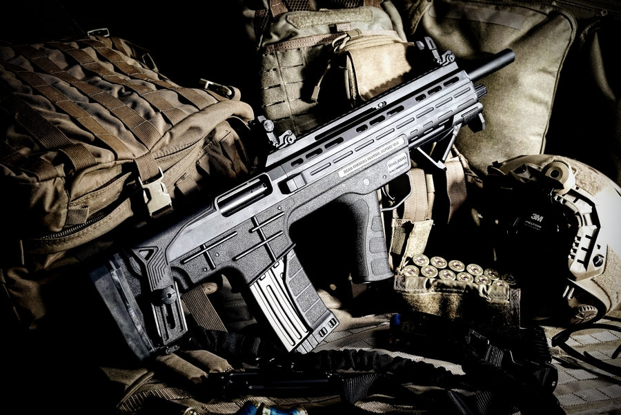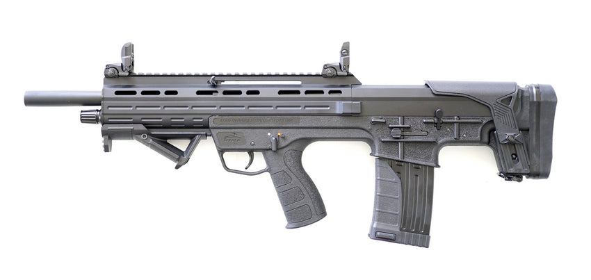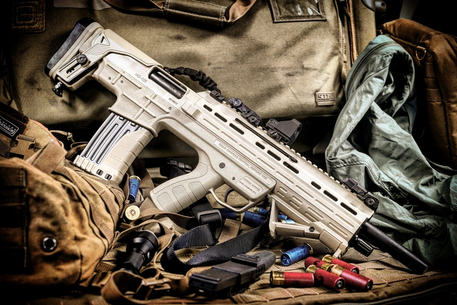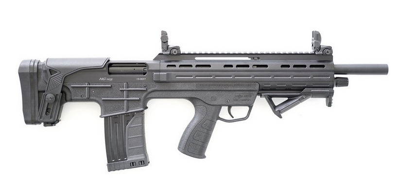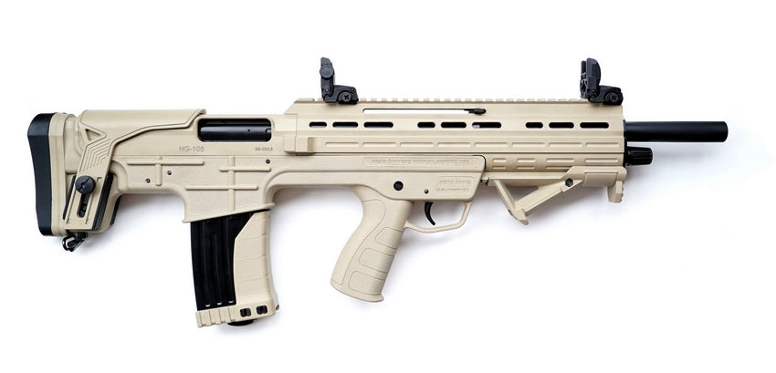 Le HG-105 est un fusil de fusil de bullpup de magazine amovible à piston à gaz semi-auto. Il a une chambre de 3 calibre 12 avec un canon de 18,5 ”. La configuration de Bullpup permet une longueur globale plus petite sans compromis en longueur de baril. Cette configuration se traduit par une distribution de poids biaisée centrale / arrière, ce qui réduit la déformation pendant de longues périodes d'utilisation et augmente la vitesse de transition dans les scénarios de prise de vue CQB et d'action. Le magazine détachable permet un rechargement facile et rapide sur les systèmes de type tube conventionnel. Les sièges de magazine sont un style d'insertion droit, permettant des recharges lisses et simplistes.