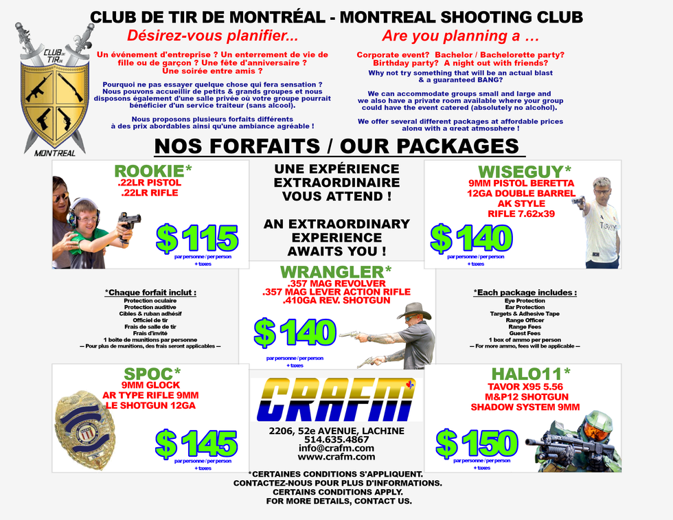 Vous pouvez venir faire une session de tir, mais avant, vous devez venir une première fois en personne et apporter deux pièces d’identité par personne, pour chaque personne qui participera à la session de tir – une photocopie fera l’affaire. Une seule personne peut se déplacer pour la première fois. Lors de cette première visite, nous vous expliquerons notre façon de procéder et vous choisirez les armes que vous désirez essayer, ce qui déterminera le coût de votre session de tir, car tout est « à la carte ». Nous regarderons ensemble la date qui vous conviendra pour votre session de tir et nous fixerons votre rendez-vous qui pourrait être une semaine ou deux semaines plus tard, selon nos agendas respectifs. Vous reviendrez ensuite à votre rendez-vous avec la ou les personnes de votre choix dont nous avons les pièces d’identité et selon ce qui a été prévu lors de votre première visite. Vous pouvez choisir une session de tir seulement, avec armes à feu, mais vous pouvez également choisir le lancer de haches OU vous pouvez combiner les deux.