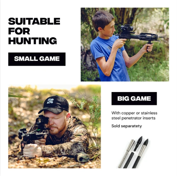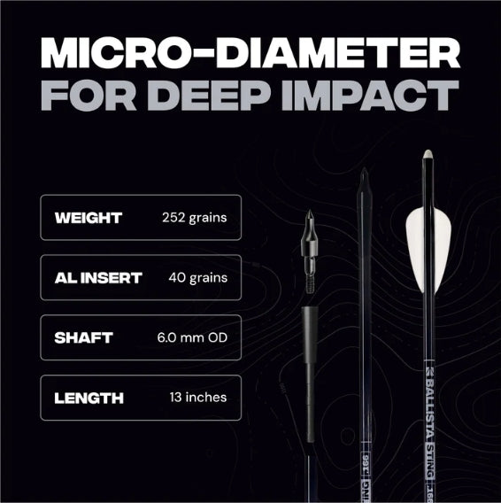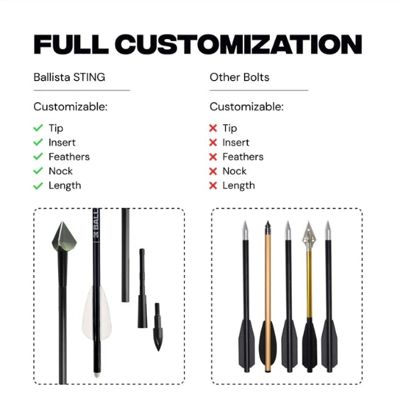 Ces carreaux BALLISTA STING MINI mesurent 16" (40,6 cm) en longueur totale, avec une hampe de 14" (35,6 cm), fabriqués en carbone pour plus de résistance et de précision. Ce lot de 6 est conçu pour une utilisation avec les arbalètes Ballista BAT et Ballista BAT Reverse, ainsi qu’avec d’autres arbalètes pistolet.