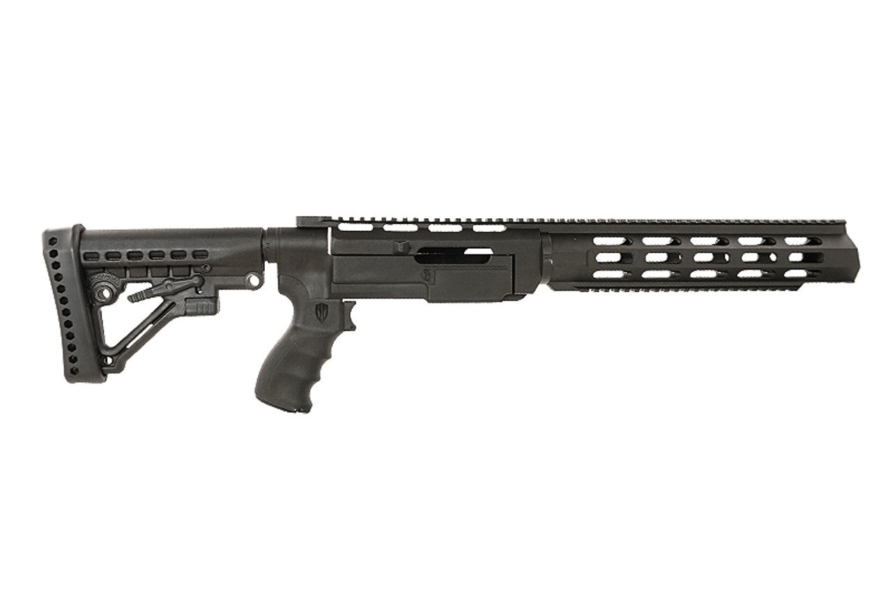 La crosse repliable à six positions s’ajuste de 10,25" à 14,25" de longueur de tirage (LOP) et intègre un compartiment de rangement dissimulé. La poignée pistolet ergonomique, nervurée pour les doigts, comporte un compartiment verrouillable pour un meilleur contrôle et plus de confort. Le kit comprend également un amortisseur de culasse en polyuréthane, un levier de déverrouillage de chargeur allongé de type palette et un dispositif de bouche en polymère compatible avec des organes de visée avant de hauteur « gas-block » pour AR-15 (organes de visée non inclus).