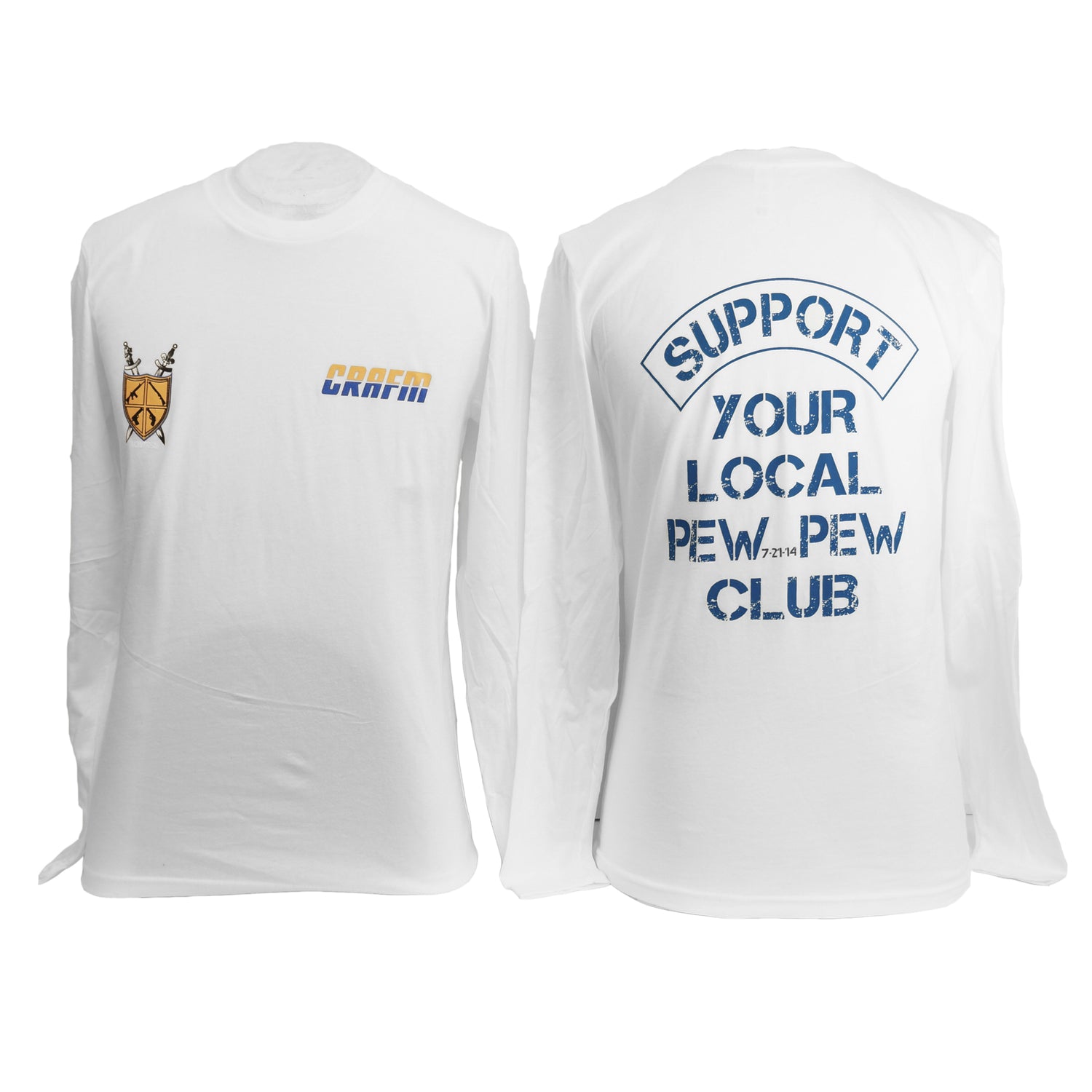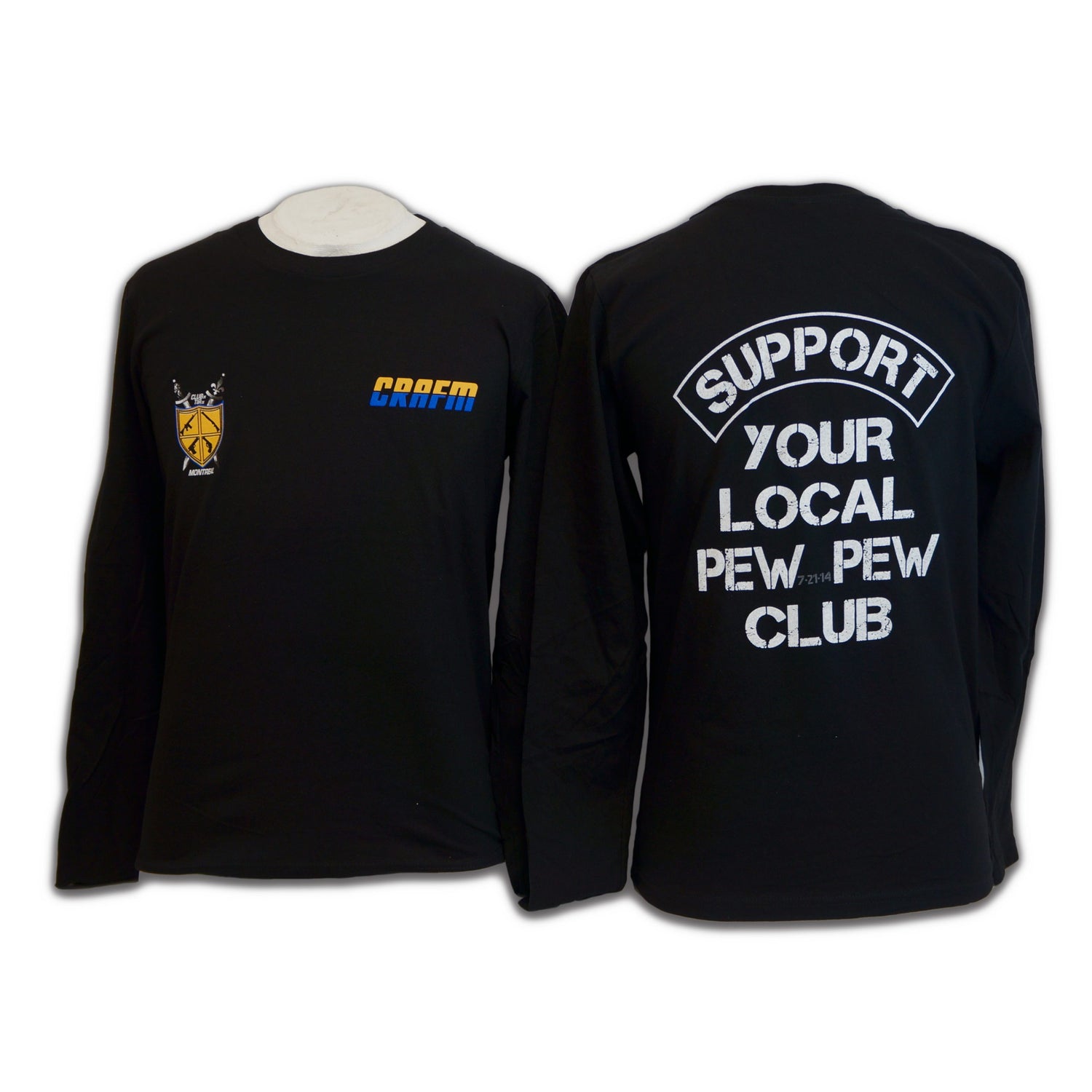 "SUPPORT YOUR LOCAL PEW PEW CLUB" Long Sleeve Shirts are 100% Combed Ring-Spun Cotton and 90/10 Cotton/Polyester. Crew neck style.