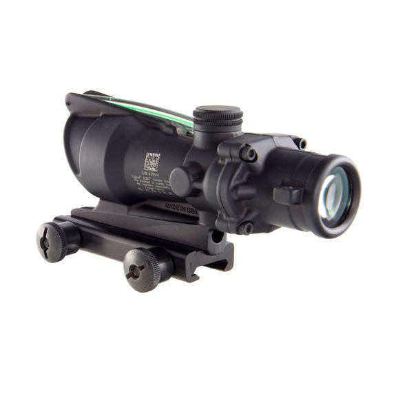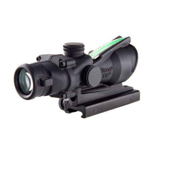 The 4x32 ACOG scope provides a dual-illuminated reticle using fiber optics and tritium for a bright aiming point in any light condition. The ranging reticle allows for bullet drop compensation out to 600 meters without any manual adjustments.